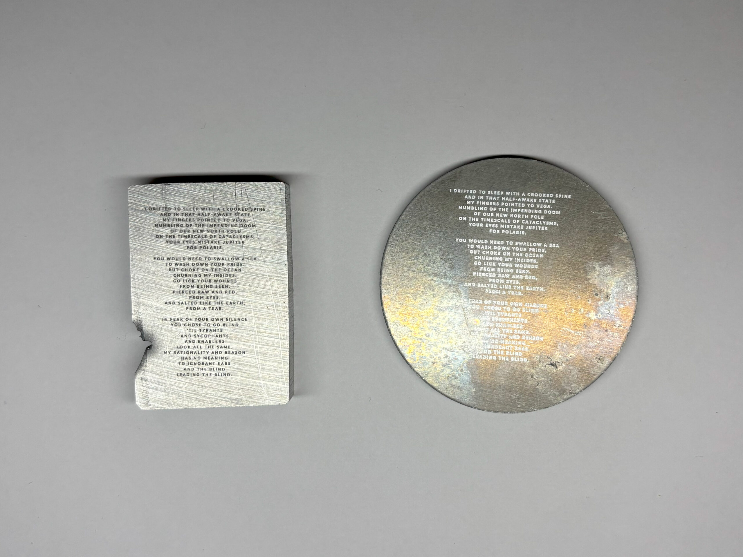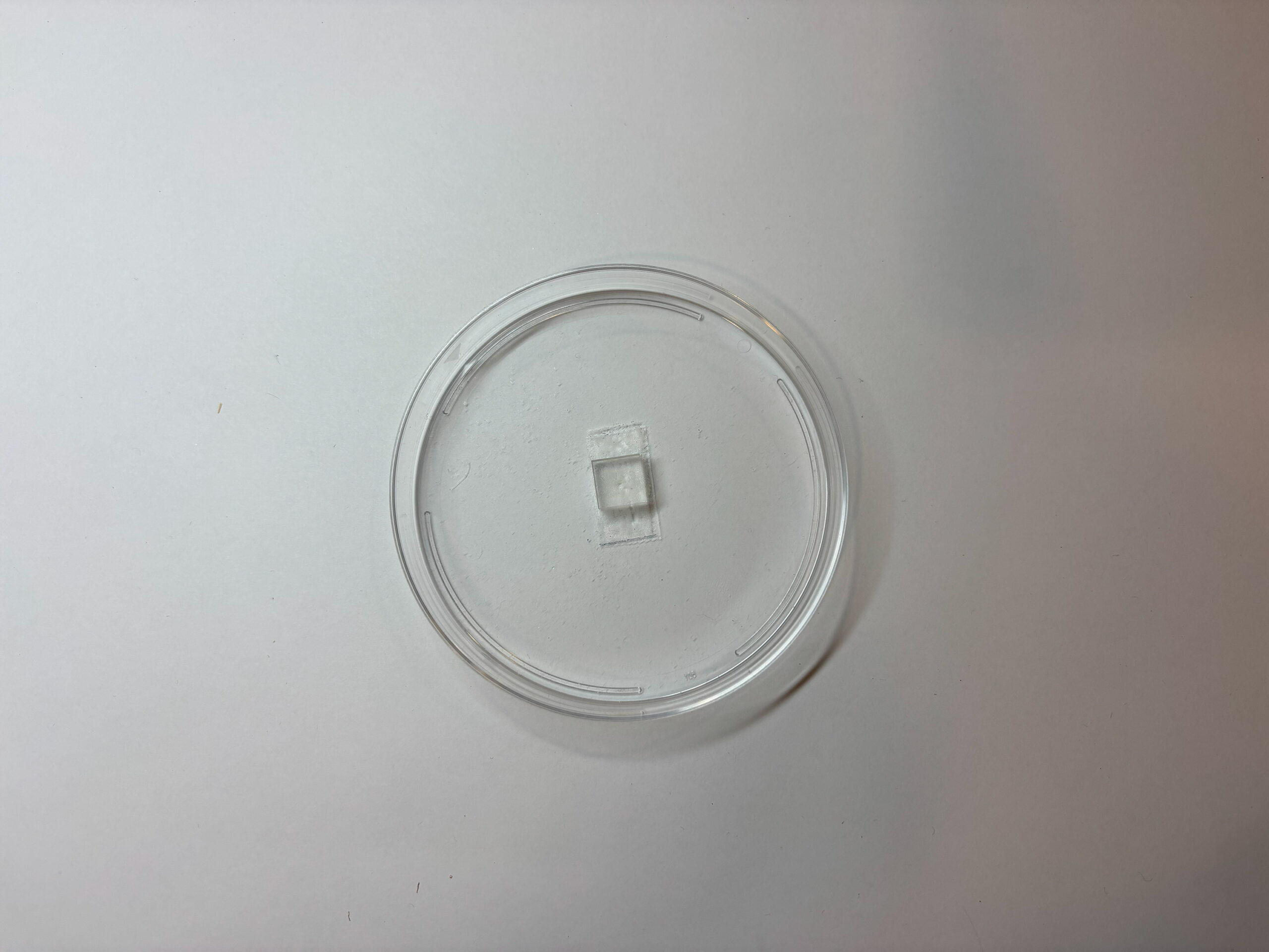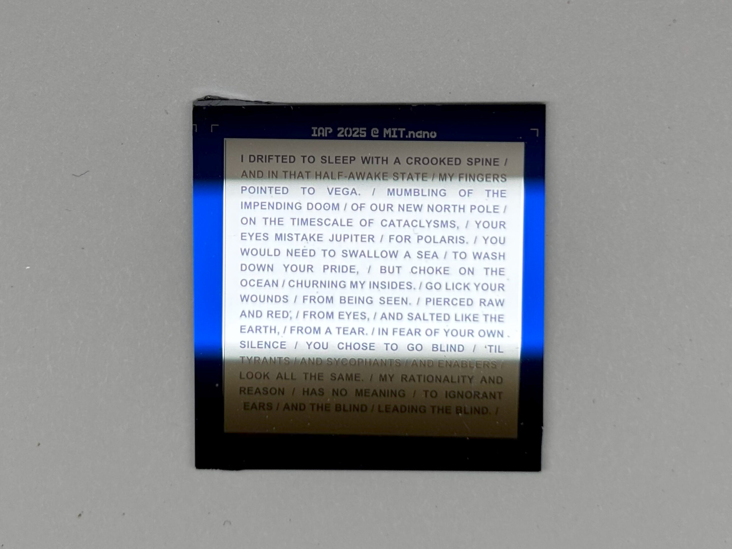 The Micropoetry (2025) project initially began as an exploration of the technology at the MIT.nano facilities, which include various equipment for fabricating and characterizing materials on the nanoscale. This resource was initially used to investigate the concept of the diffraction limit of the human eye, a physical threshold in optics where the human eye can longer resolve an image. Fabricating text on the nanoscale was the first step in this project, since text needs to be readable in order to gain meaning from it. While the main fabrication process at MIT.nano for fabricating on the nanoscale is a micro photolithographic process, it involved many steps with specialized machines that required specialized training. Instead, I settled on a 3D printing process that could print at the nanoscale. With the help of Ardalan SadeghiKivi, a staff member at MIT.nano, we made a print on an UpNano NanoOne 2-photon-based 3D printer, which uses a laser to cure resin at the nanoscale. The result was a 3D print of the words “technocrat utopia” printed in resin on top of a 10mm by 10mm by 5mm clear resin substrate base. This initial experiment produced the intended effect: the text is invisible to the unaided eye but was perfectly visible when viewed under a telescope. However, a glaring issue soon popped up: the print was too fragile to handle. With every attempt at handling the print, I had to be careful not to introduce too much movement, or accidentally swipe the surface where the text was printed. While I was able maintain the integrity of the print throughout successive attempts at characterization, the print deteriorated after each attempt, to the point that the print was completely destroyed.