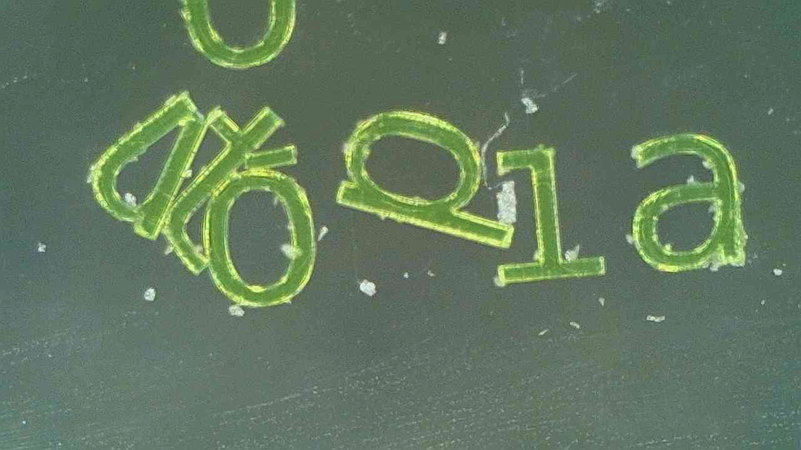 After this experience, alternative processes were pursued for fabricating text on the nanoscale that could withstand being handled on the human scale. The first alternative process that was attempted was laser micromachining with the xTool F1 Ultra laser engraver tool located in the Center for Bits and Atoms lab. The tool uses a laser to machine an image on substrate from top to bottom in successive lines. This required a heuristic calibration process to determine the smallest resolution the machine could produce, which depended on the power and speed of the laser, as well as the composition of the substrate. The results were two pieces of aluminum with the overall dimension of 50 millimeters with a text resolution of just under one millimeter per line of text.
