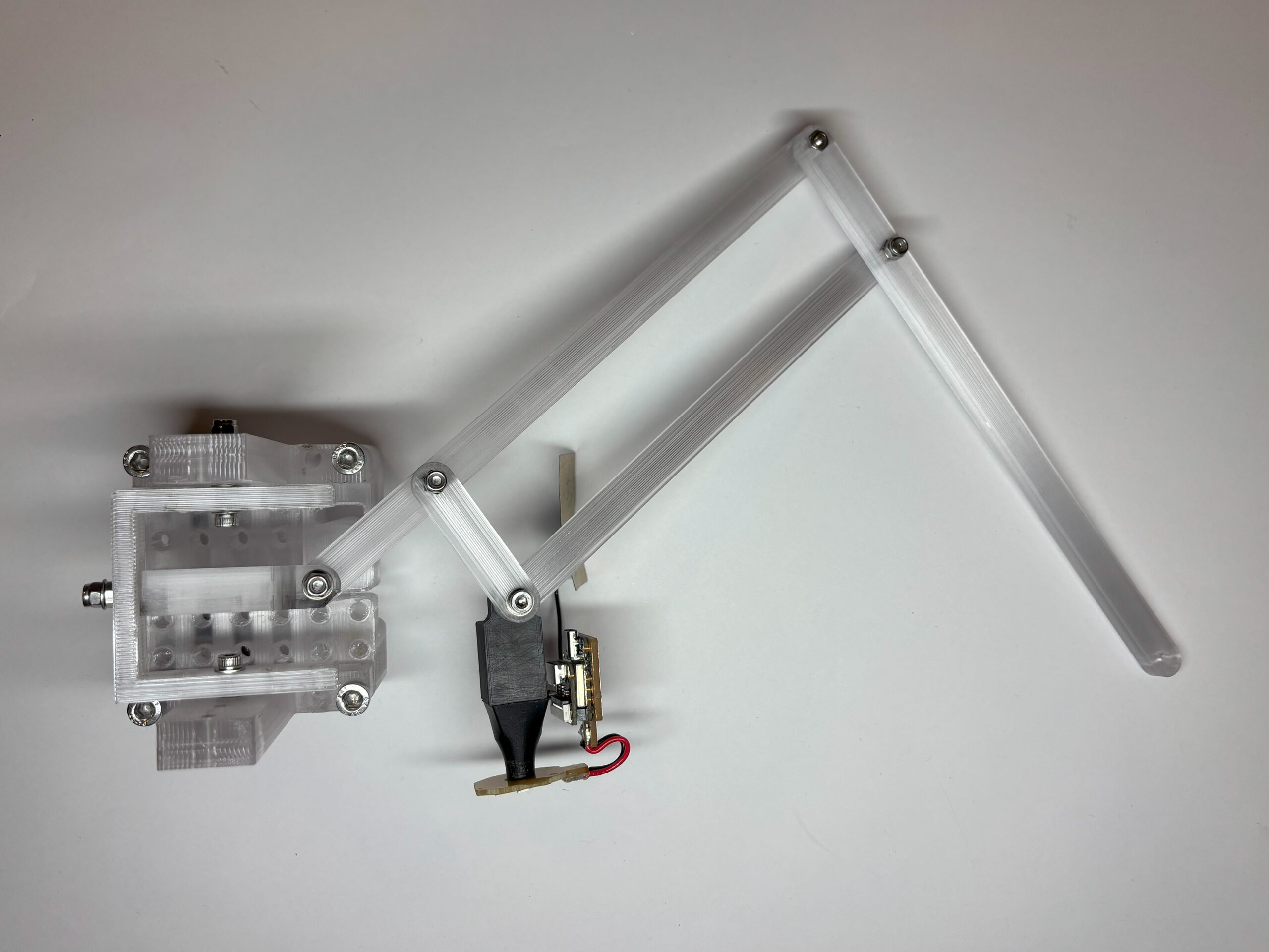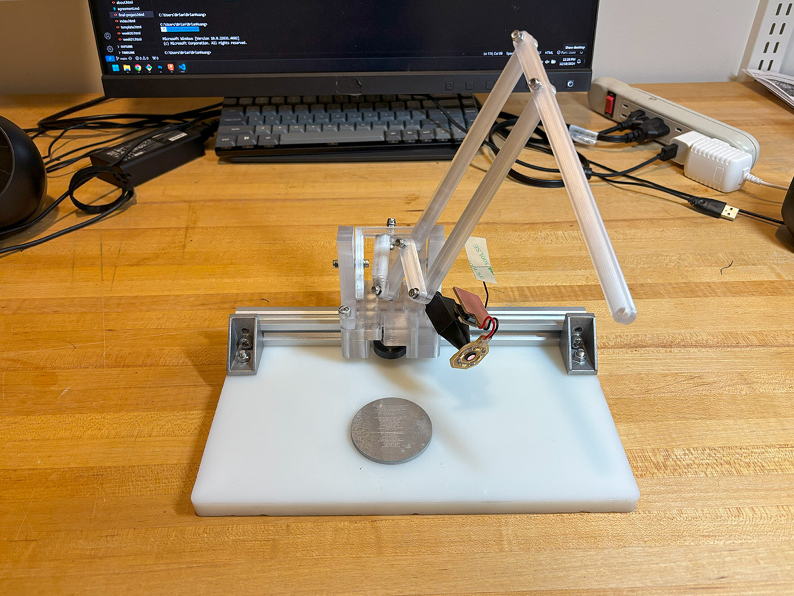 The anchor point of the pantograph is connected to the center of a universal joint, allowing for rotational movement in three dimensions. This universal joint is then placed on a linear motion carriage piece so that the apparatus could move perpendicular to the linear motion of the pantograph. An optical apparatus for performing live imaging made from a modified XIAO ESP32S3 camera module is placed on the colinear corner of the parallelogram. The camera module is modified by first removing the original lens, exposing access to the onboard camera sensor. A custom designed and 3D printed lens barrel is installed on top of the camera sensor, while the original camera lens is inverted and installed on the other side of the lens barrel, turning the entire apparatus into a 20x microscope objective. The entire mechanism is then installed atop a piece of HDPE that serves as a base, where a sample for characterization can be placed.