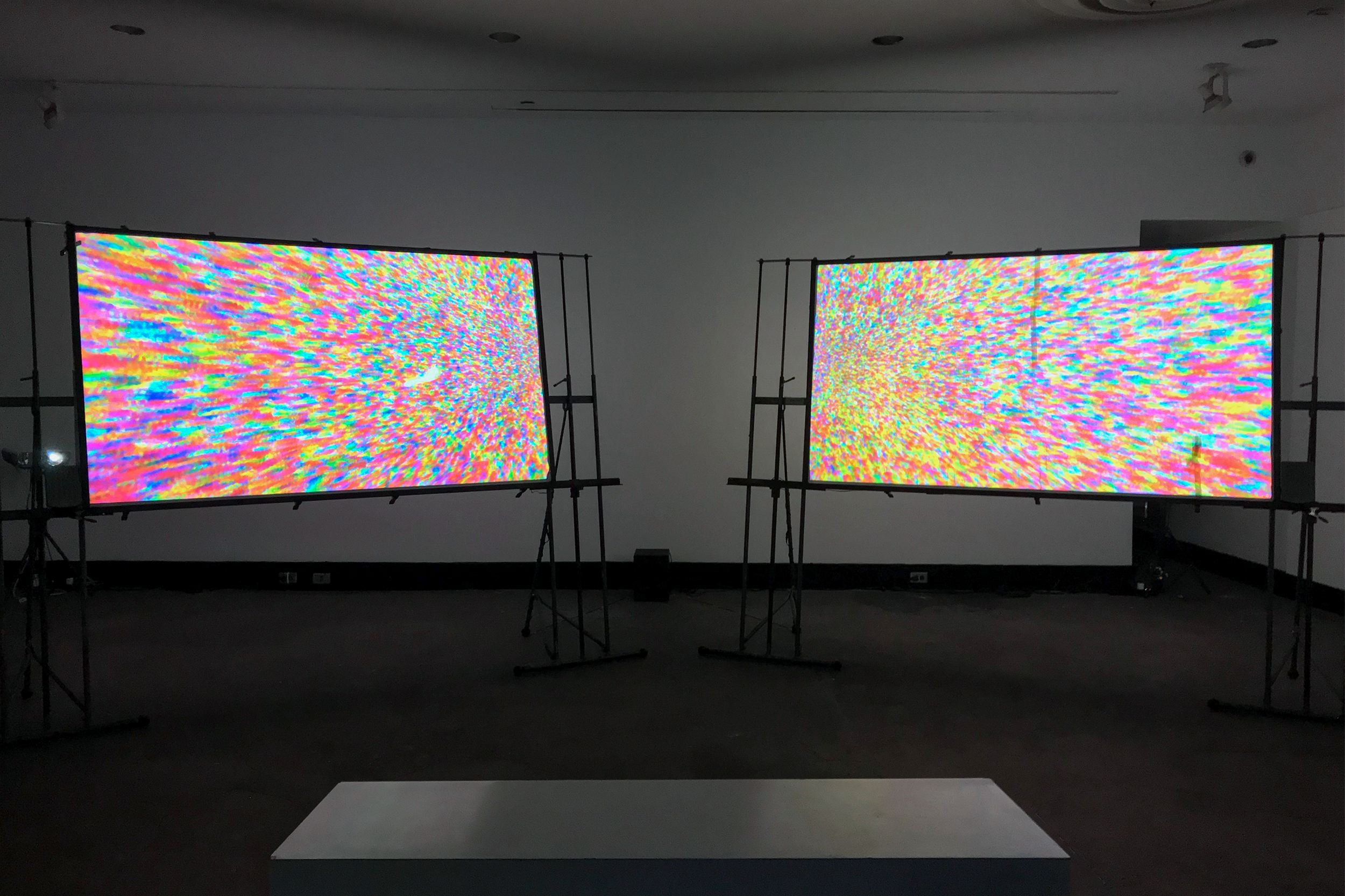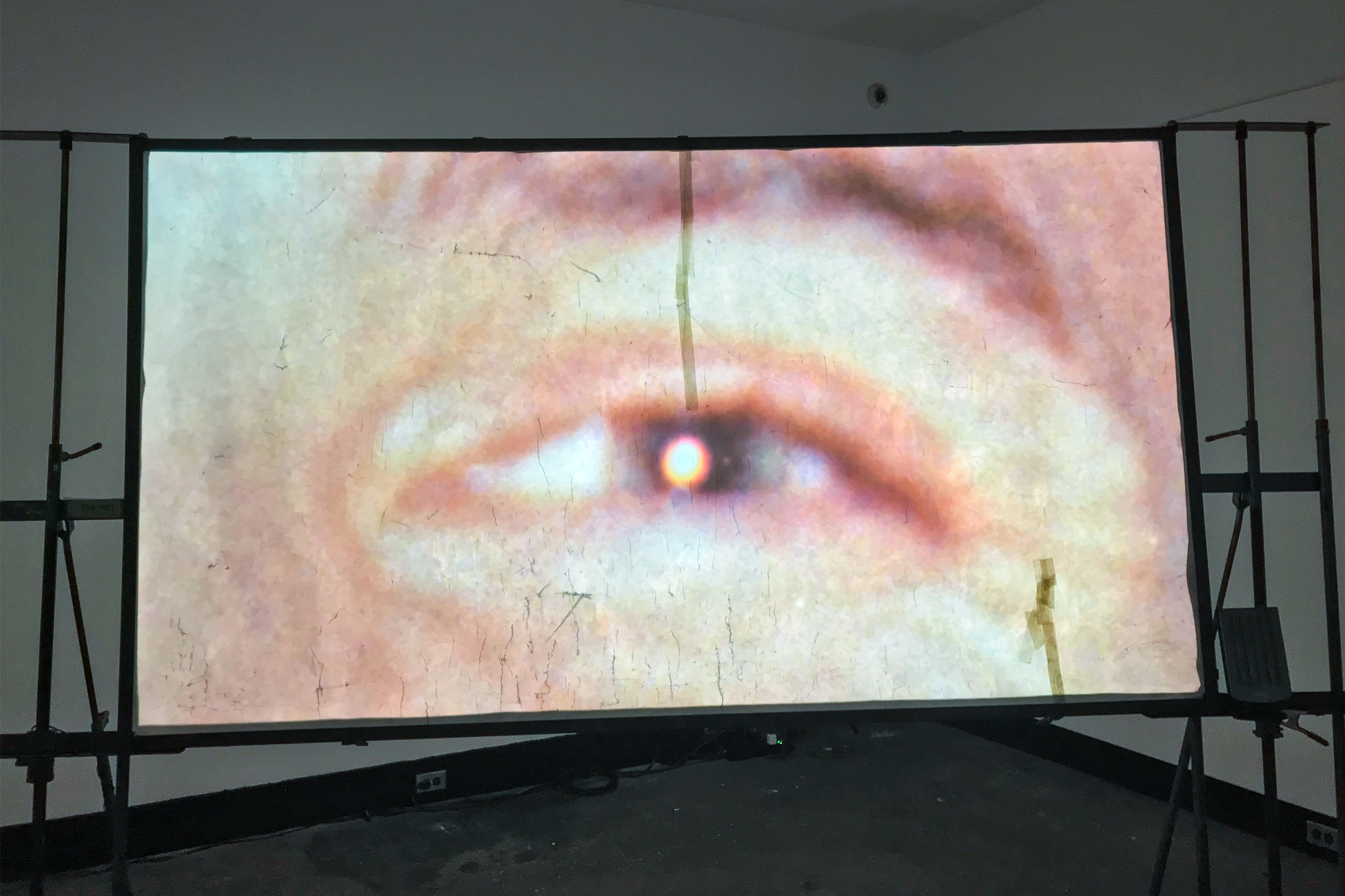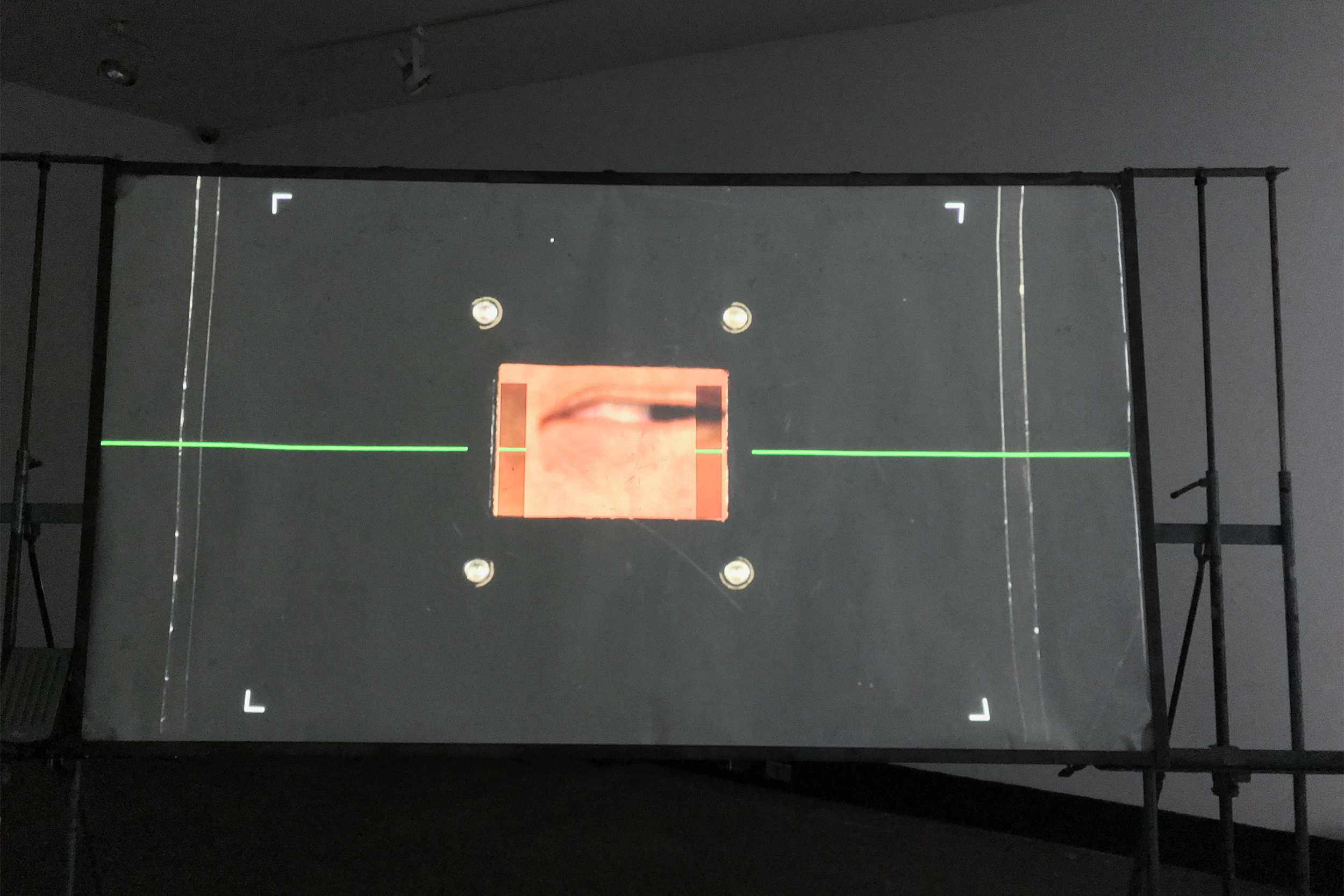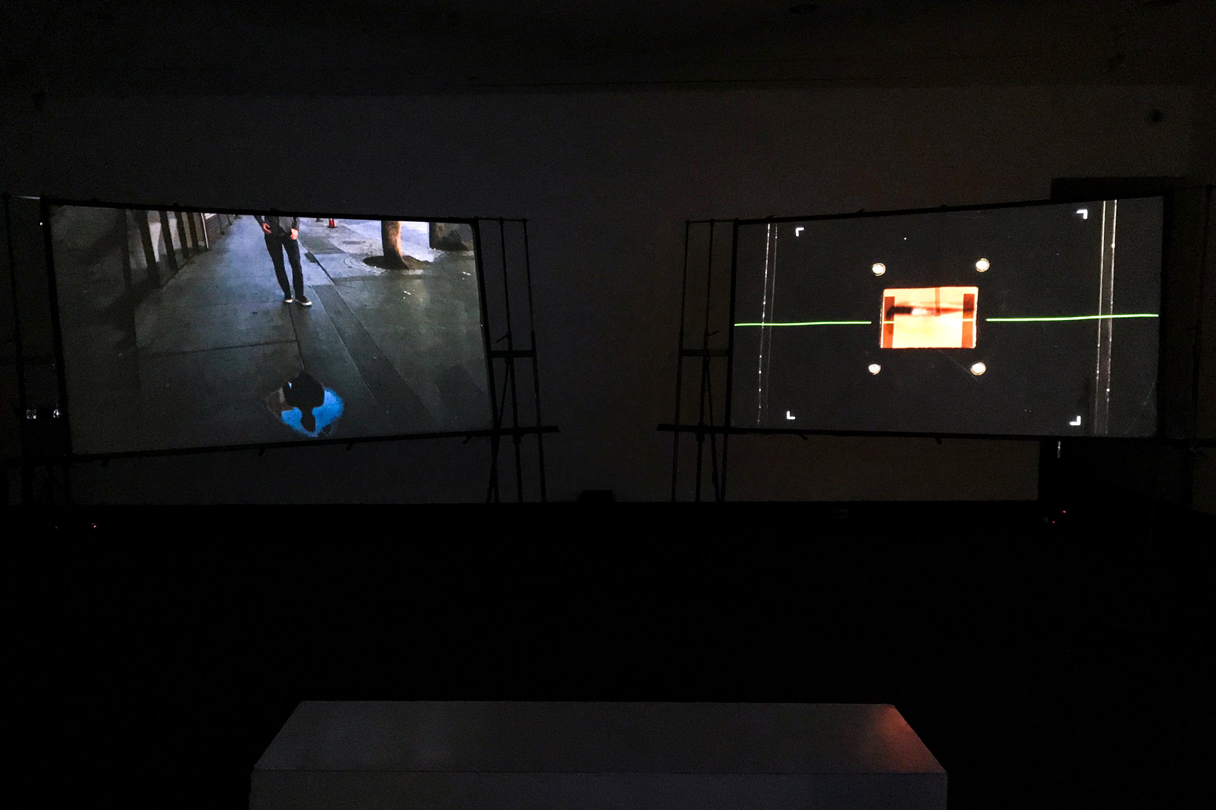 HD video, color, sound, 09:07 min., two projectors, white seamless paper, wax, masking tape, footprints, metal stock, nuts, bolts, oil, spring clamps, four metal easels, white bench, speakers, wires, extension cords